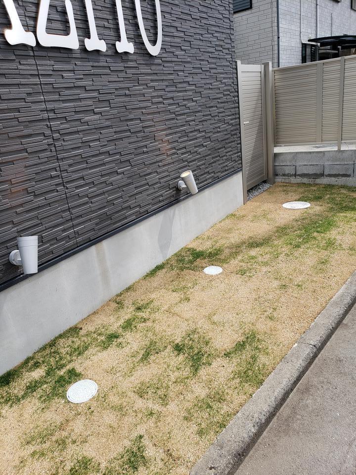 開業当初に敷いた芝は残念ながらうまく育たず。。。
